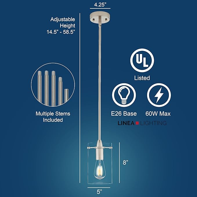 • COMPATIBLE WITH MOST STANDARD MEDIUM BASE BULBS - This brushed nickel kitchen pendant light fixture comes with medium clear glass shade that has a diameter of 5" and a height of 8"