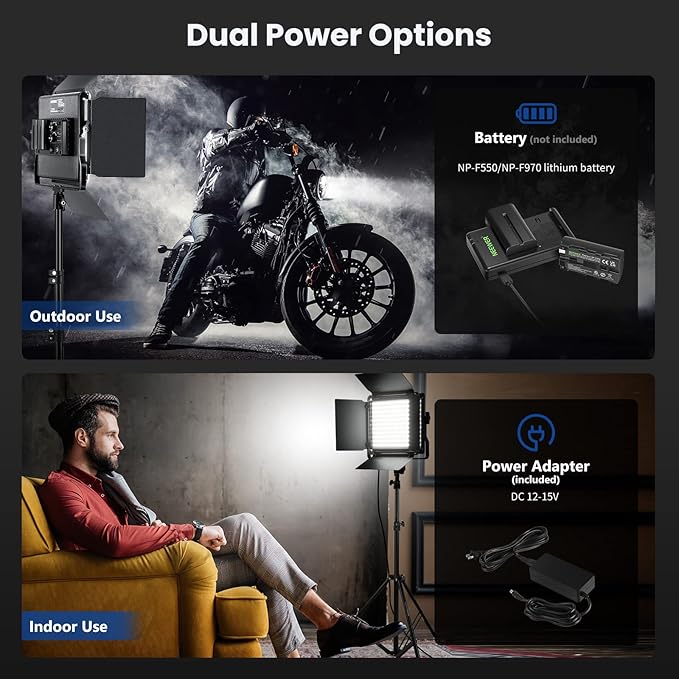 • 【Dual Power Options & LCD Screen】 Power the lights with an AC power adapter or enjoy cable free operation with an NP-F550 or NP-F970 Li ion battery (Not included) when you photograph outdoors. High definition LCD screen lets you check the brightness, color temperature and battery power in real time