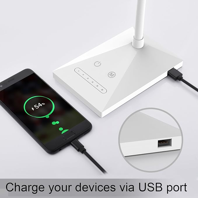 • Built-in USB Charger And Adapter Included: There is a built-in 5V/1A USB output on the side of the table lamp base; You can recharge your smartphone or other USB-compatible devices via the port while lighting, no need to waste other outlet space; Also, the led desk lamp can be powered with the adapter (DC 12V/1A) in the package