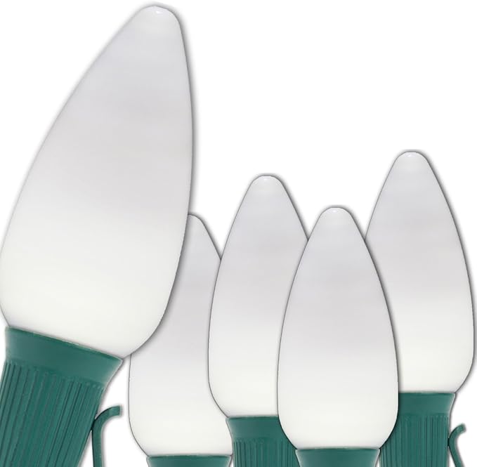 • [ C9 COOL WHITE SMOOTH/OPAQUE NON-TWINKLE LED LIGHTS ] 50 cool white smooth/opaque OptiCore C9 steady LED bulbs and 50-foot green stringer with 50 sockets spaced 12 inches apart. 6-inch lead with fused polarized male plug and 6-inch tail with female plug for easy end to end connections. 50 feet total length. To assemble, simply twist bulbs into sockets.