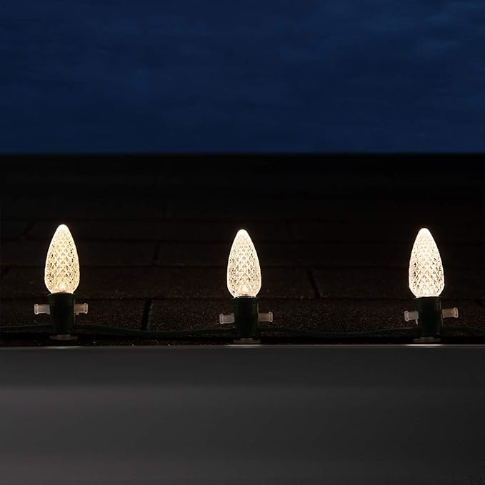 • [ C9 WARM WHITE NON-TWINKLE LED LIGHTS ] 50 OptiCore warm white C9 steady LED bulbs and 50-foot green stringer with 50 sockets spaced 12 inches apart. 6-inch lead with fused polarized male plug and 6-inch tail with female plug for easy end to end connections. 50 feet total length. To assemble, simply twist bulbs into sockets.