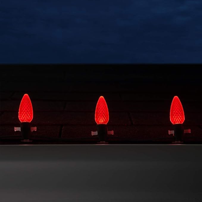 • [ C9 RED NON-TWINKLE LED LIGHTS ] 50 OptiCore red C9 steady LED bulbs and 50-foot green stringer with 50 sockets spaced 12 inches apart. 6-inch lead with fused polarized male plug and 6-inch tail with female plug for easy end to end connections. 50 feet total length. To assemble, simply twist bulbs into sockets.
