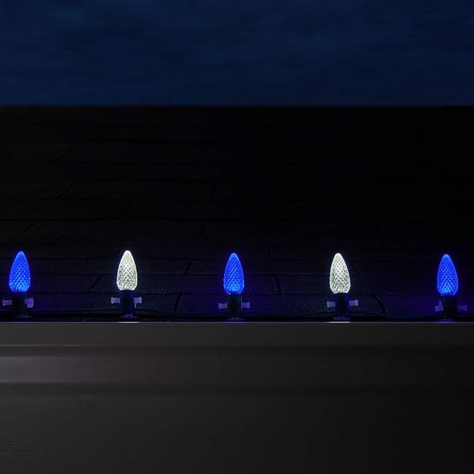 • [ C9 BLUE and COOL WHITE NON-TWINKLE LED LIGHTS ] 50 blue and 50 cool white OptiCore C9 steady LED bulbs and 100-foot green stringer with 100 sockets spaced 12 inches apart. 6-inch lead with fused polarized male plug and 6-inch tail with female plug for easy end to end connections. 100 feet total length. To assemble, simply twist bulbs into sockets.