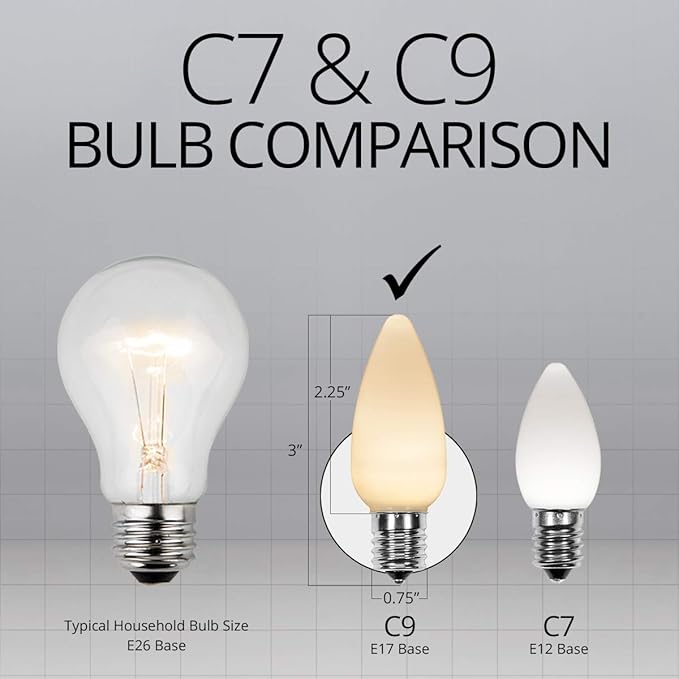 • [ C9 WARM WHITE SMOOTH NON-TWINKLE LED BULBS ] Box of 25 OptiCore warm white smooth C9 steady LED bulbs, E17 bases. Fits any standard C9/E17 stringer socket.