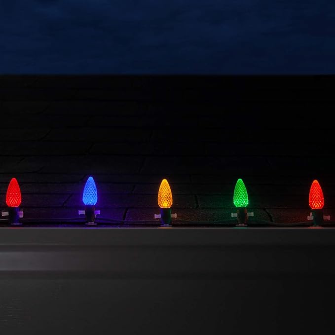• [ C9 MULTICOLOR NON-TWINKLE LED LIGHTS ] 100 OptiCore multi color C9 steady LED bulbs and 100-foot green stringer with 100 sockets spaced 12 inches apart. 6-inch lead with fused polarized male plug and 6-inch tail with female plug for easy end to end connections. 100 feet total length. To assemble, simply twist bulbs into sockets.