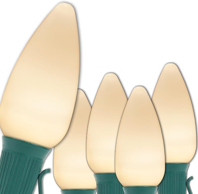 • [ C9 WARM WHITE SMOOTH/OPAQUE NON-TWINKLE LED LIGHTS ] 50 warm white OptiCore smooth/opaque C9 steady LED bulbs and 50-foot green stringer with 50 sockets spaced 12 inches apart. 6-inch lead with fused polarized male plug and 6-inch tail with female plug for easy end to end connections. 50 feet total length. To assemble, simply twist bulbs into sockets.