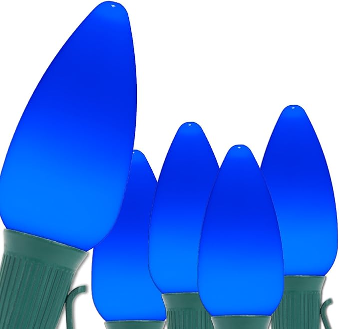 • [ C9 BLUE SMOOTH/OPAQUE NON-TWINKLE LED LIGHTS ] 100 blue smooth/opaque OptiCore C9 steady LED bulbs and 100-foot green stringer with 100 sockets spaced 12 inches apart. 6-inch lead with fused polarized male plug and 6-inch tail with female plug for easy end to end connections. 100 feet total length. To assemble, simply twist bulbs into sockets.