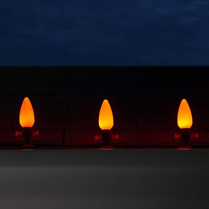 • 25 BULBS, 25 FT STRINGER - 25 Orange Smooth/Opaque steady/non-twinkle C9 OptiCore LED bulbs on 25 ft 18-gauge SPT1 green wire, sockets spaced 12 in apart, with 6 in lead and 6 in tail. Each bulb 0.8W (20W per set, 0.17A). Fused polarized male plug and female plug. End-to-end connectable up to 1,000 ft. Powered by standard 120V household outlet.