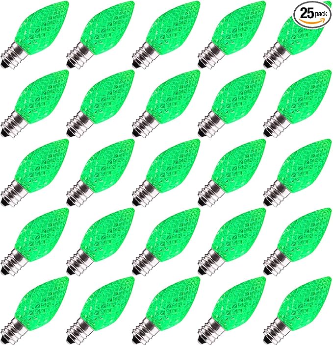 25 Pack C7 Led Replacement Christmas Light Bulb, C7 Shatterproof Led Bulbs for Christmas String Lights, E12 Candelabra Base, Commercial Grade Dimmable Holiday Bulbs, Green