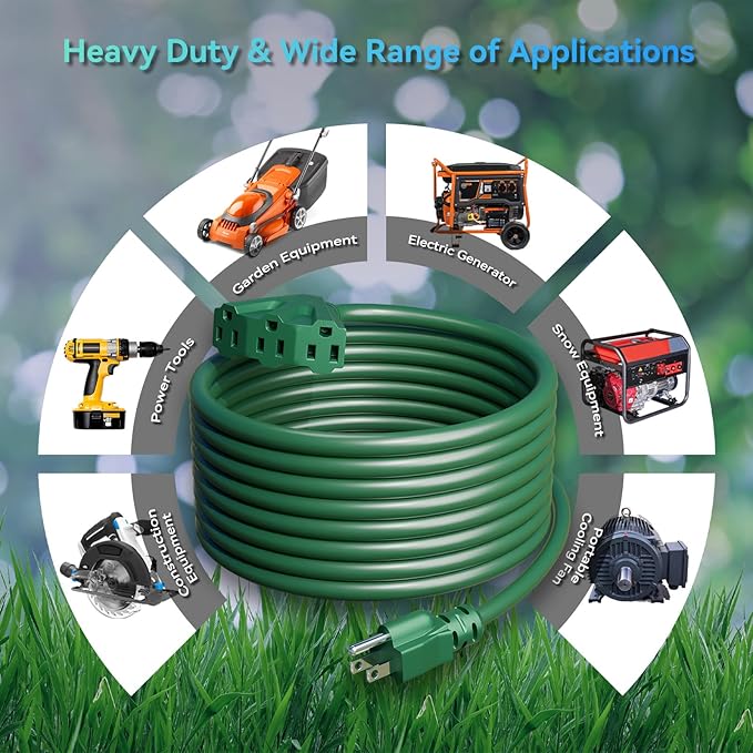 • Indoor & Outdoor Use - Our multi tap pigtails Design lets you use up to 3 appliances/tools at the same time, just makes it easy and convenient, letting you add another tool or any other power device right there without pulling out an extra cord! This power extension cord is designed to extend the connection to your wall outlet or any power devices. Convenient to have for your Home, Office, Garage. Great for landscaping, gardening, and powering appliances such as shop vacs, weed wackers.