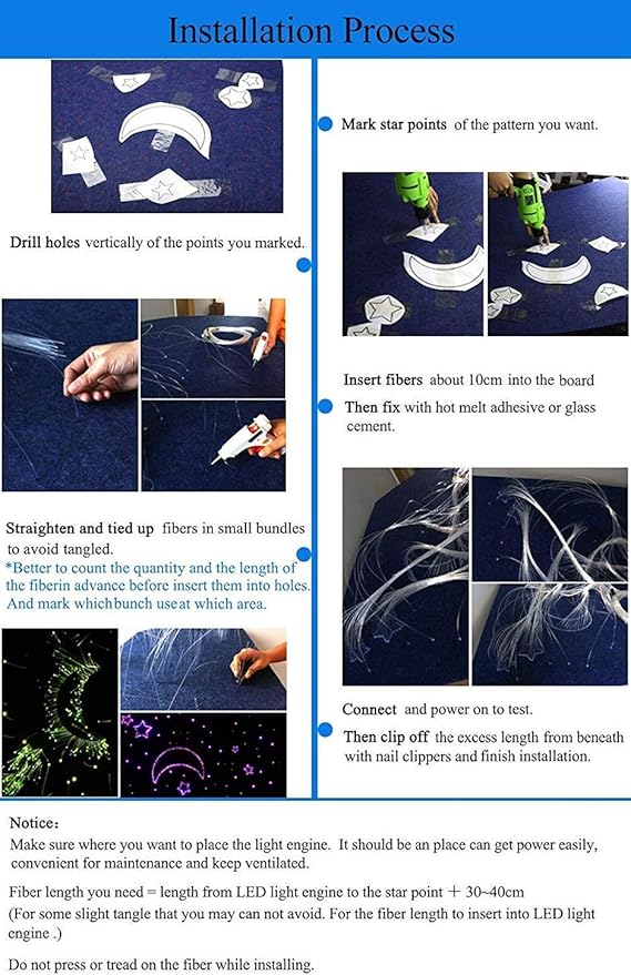 • 【Perfect gift 】Our twinkle fiber optic star ceiling light sets are suitable to install in indoor cars, shops, hotels, bars, coffee shops, DISCO, weddings decoration, home ceiling decoration, KTVs, parties and any other leisure areas to make star ceiling sky interior decoration