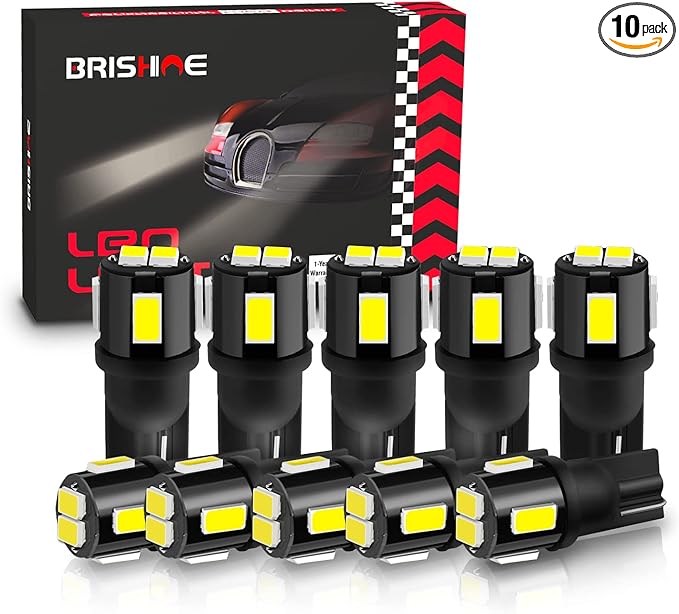 • ★Super Bright: Pack of 10 bulbs. Luminous Flux:300lm/bulb. Color:6000K Xenon White. Working Voltage:12V DC. Wattage:2W/bulb. 6PCS 5630-SMD LED Chips, much brighter than halogen bulbs. 360-degree lighting angle, no visual blind, bring you a bright and comfortable lighting experience.
