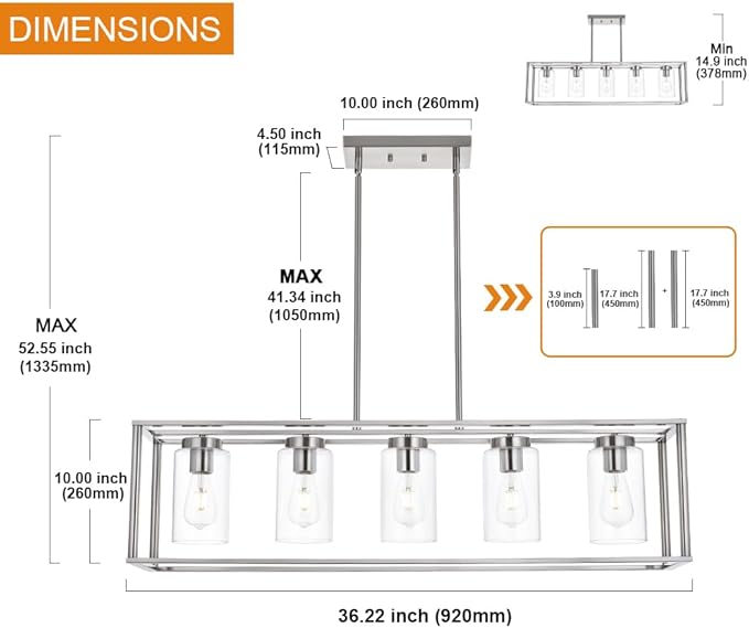 • Contemporary Design: This simple linear island pendant lighting with clear glass shade, unique designed to illuminate the heart of your kitchen, dining room or farm styled places