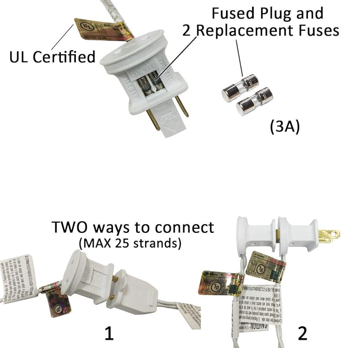 • Installtions: It needs 2 fuses work together, if one of the fuses broken or stopped working, you need to change both fuses. the string light is tandem, and one of bulbs not work, it is time to replace the bulb. Please make sure you power off the light before replacing. Step 1, pull the socket out from the shell. Step 2, pull the bulb from the socket. Step 3, replace, then power on. Please double-check the number of the bulbs, it totally has 10 bulbs (plus 4 spare bulbs)in one set