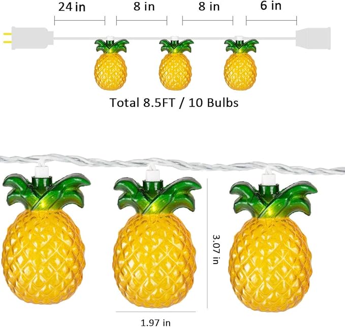 • 10 Pineapple lights on White Wire, 8" Bulb Spacing with 24" Lead (24" X 8" X 6"), 8.5 foot Total String Length