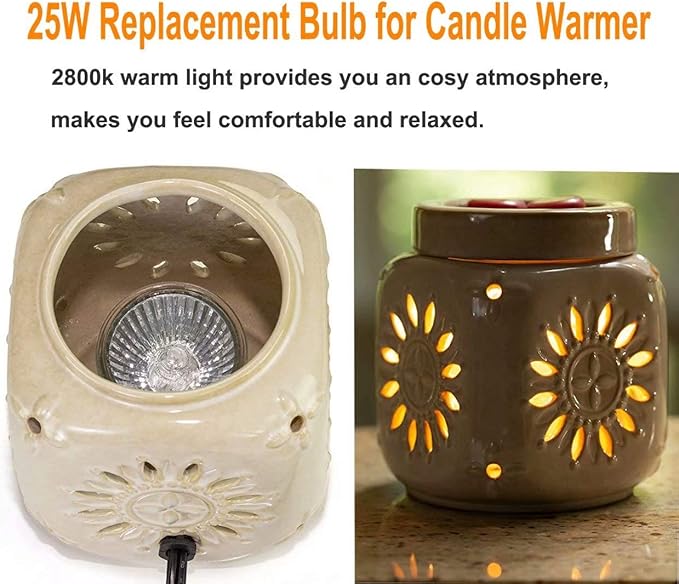 • 【NP5 GU10 120V 25W Bulb Candle Warmer】: MR16 gu10 halogen fits in any of your favorite Candle Warmer Lamps created after 2008. These gu10+c 120v 25w halogen light bulbs use a concentrated halogen beam to melt scented jar candles without overheating or under heating, gently release fragrance throughout your home, providing you a warm and gentle feeling.