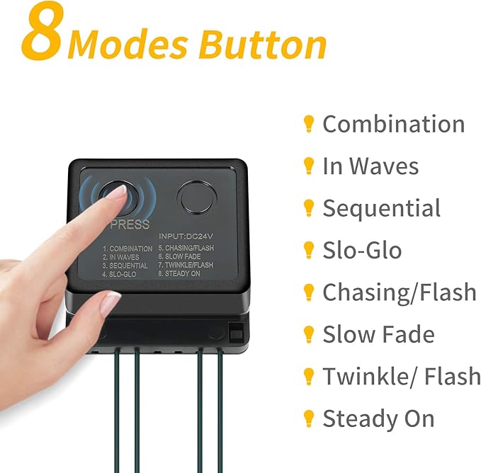 • 8 Lighting Modes & Memory Function:This Christmas string light with 8 different lighting modes(combination, in waves, sequential, slogs, chasing/flash, slow fade, twinkle/flash, and steady on), you can press the button on the adapter to change. Intelligent memory function design to remember the last setting after cutting off the power, no need to set the light again.