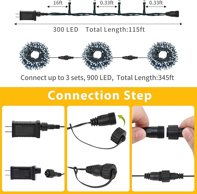 • 3 Sets Connectable:This super long 115Ft fairy string lights with 300 cool white individuals LED bulbs. And each Christmas light has an end-to-end connection that allows up to 3 strands connected together to illuminate a wider range. They will brighten up the dark corner for happiness atmosphere inside or outside.