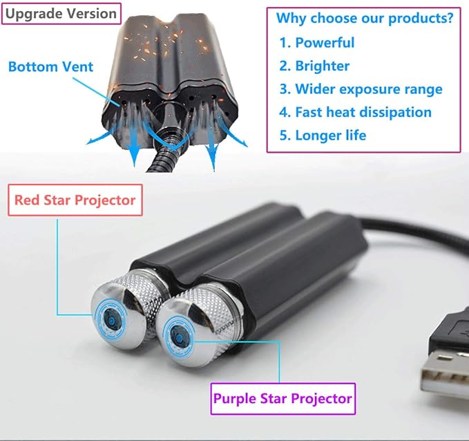 • 2 in 1 Design: The car roof star light combined the red and purple, it is powerful, brighter and wider exposure range. With bottom vent function, this star light is not hot when working and have a longer life