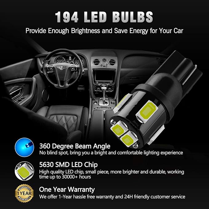 194 LED Bulbs Extremely Bright Ice Blue 5630 Chipsets 168 2825 175 T10 W5W LED Replacement Bulbs for Car Interior Dome Map Door Courtesy Trunk License Plate Lights(Pack of 10)