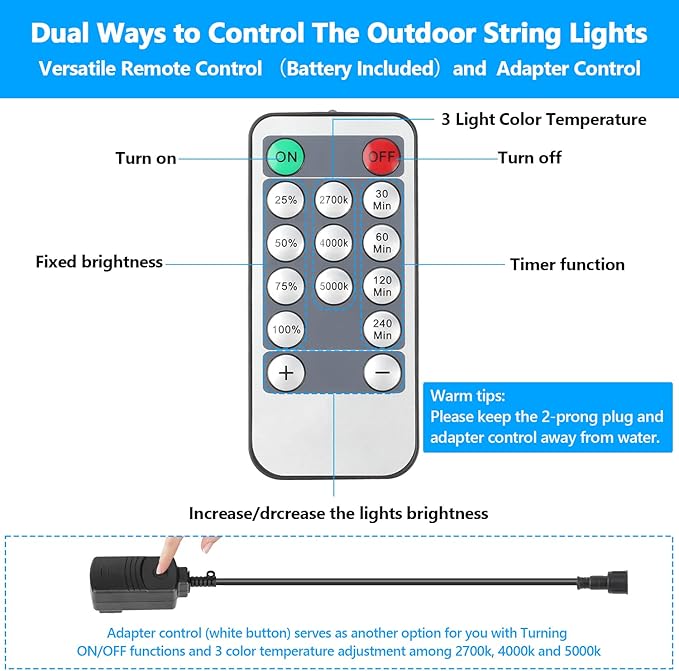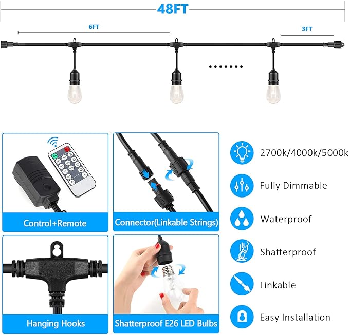 • Upgraded 3 Color Dimmable LED Outdoor String Lights for Patio. These commercial LED string lights feature 3 colors in one: 2700K warm white, 4000K natural white, and 5000K daylight white, perfect for various occasions like Christmas, weddings, parties, and reunions