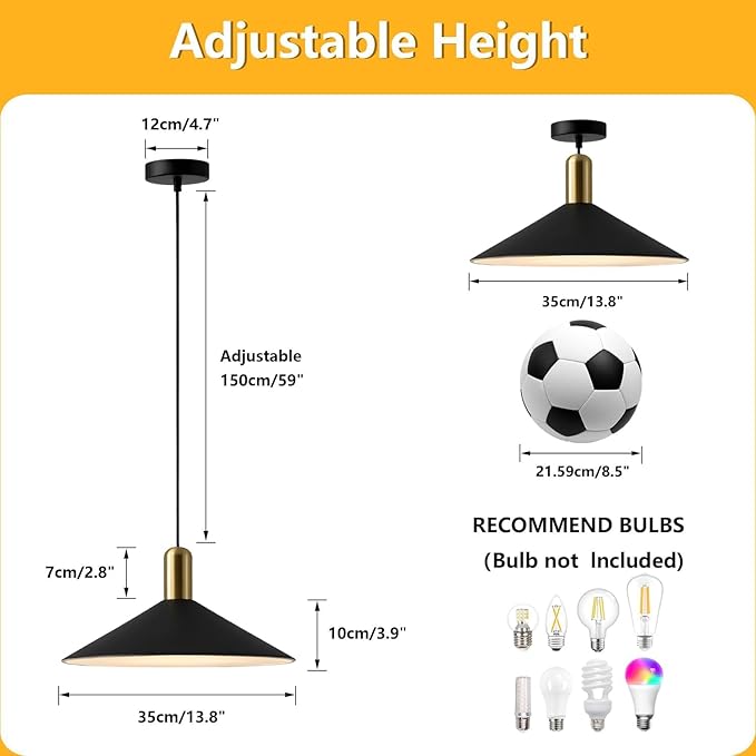 • Black Pendant Light Size: The black and gold pendant light fixture for kitchen island shade width: 13.8”(35cm), height: 9”(23cm), canopy: 4.7”(12cm). Light source: E26 (Bulb not Included), voltage: 110-220V for worldwide. The farmhouse pendant light can be dimmable when work with dimmable bulb and switch