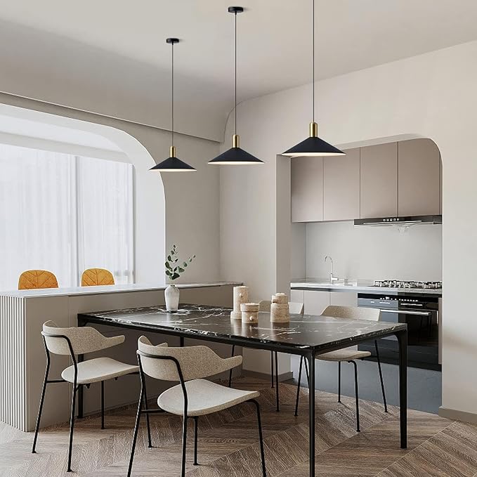 • Black Cone Pendant Light: The black and brass pendant lights kitchen island consists of a matte black metal dome and a gold decoration, creating a farmhouse and industrial pendant light. The dome shade of the black pendant light directs the light downward, and the interior is painted white. Ideal for multiple decor styles including vintage, farmhouse or contemporary