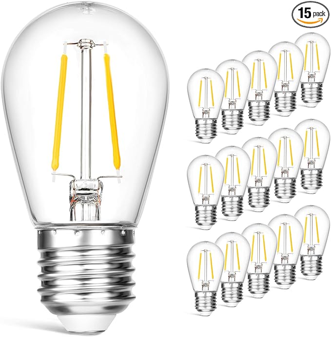 15 Pack Dimmable Shatterproof S14 LED Replacement Outdoor String Light Bulbs, 2700K 2W Plastic LED E26 Medium Screw Base Edison Bulbs Equivalent to 11-25 watt