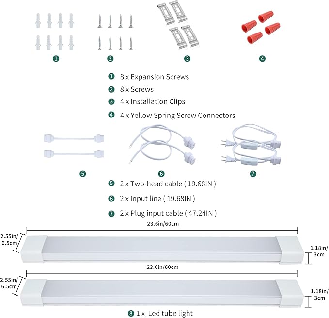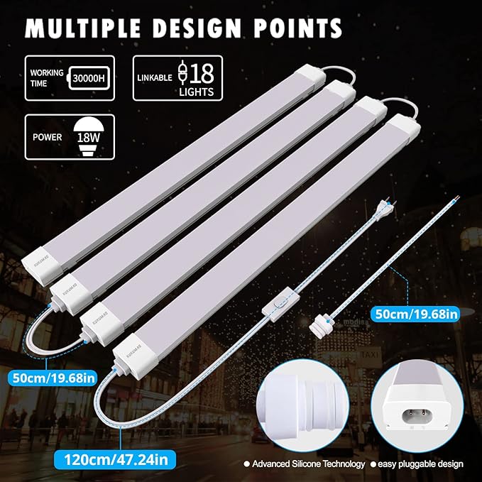 • 【LINKABLE AND NO FLICKER】This led tube light could connect up to 18 tube lights together with 19.6 inches connector cords. comfortable led shop light fixture. With 180° wide-angle beam, This led ceiling and closet light is no flickering.