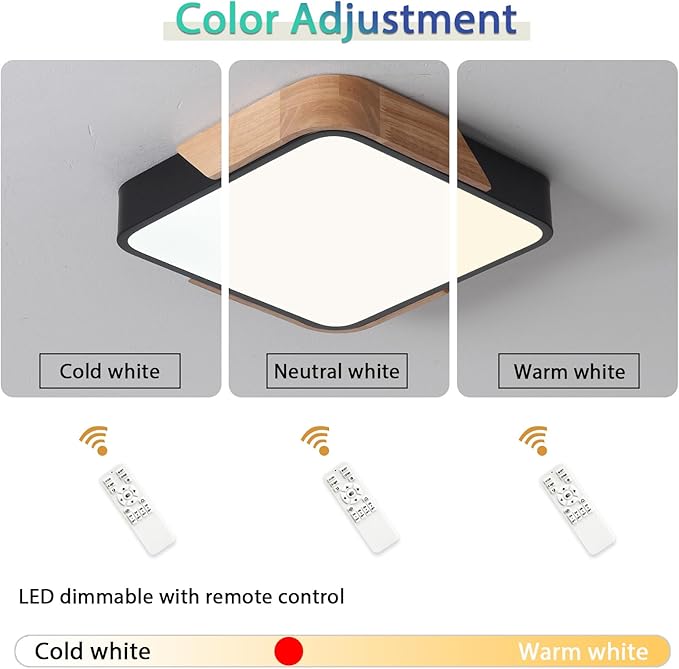 • Dimmable 3 color temperatures:Wood ceiling light fixture dimmable (cool white light 6000 K - natural light 4000 K - warm white light 3000 K), Also the brightness is adjustable from 10% to 100% (The remote control is included). Lights with memory function are three color temperatures that can be controlled by a normal switch on the wall. You can also use the remote control to turn the light on/off, change the color temperature and adjust the brightness