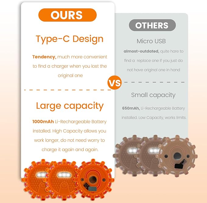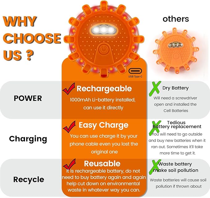 • Special attention: we upgraded the road flares to a Type-c cable(The color is black or white) on July 3, 2023, and used a large capacity lithium battery, which can last longer and be more helpful.