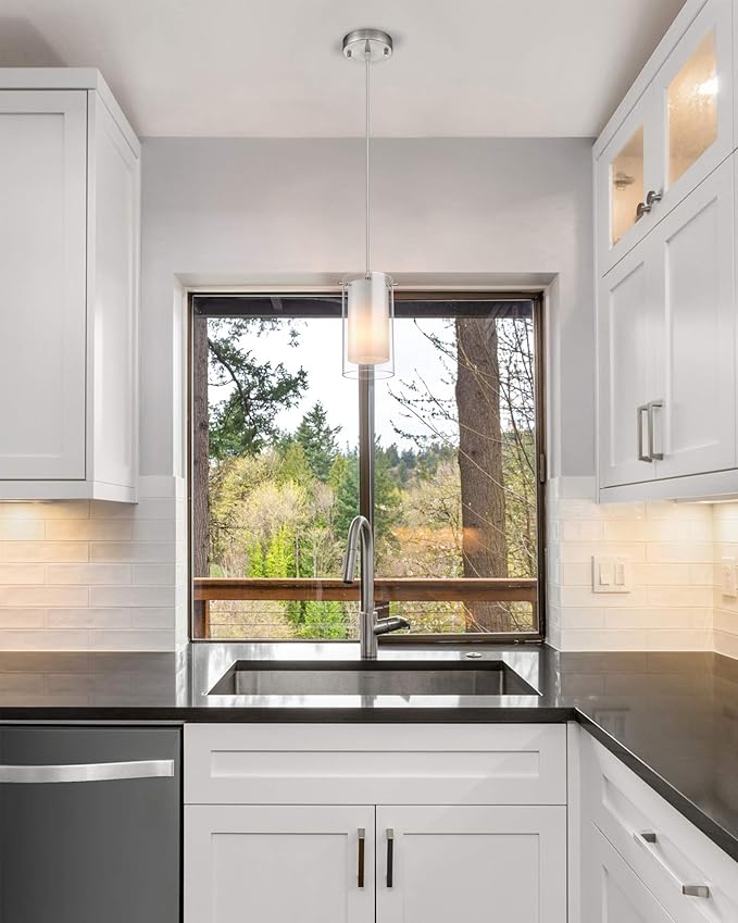 • DUAL GLASS DESIGN: This 2 Pack brushed nickel pendant light features an external clear glass shade and an inner frosted glass shade that softens the glows to create a warm and comfortable ambient, perfect for kitchens, bedroom, dining rooms, bathrooms, home bars, and hallway indoor lighting