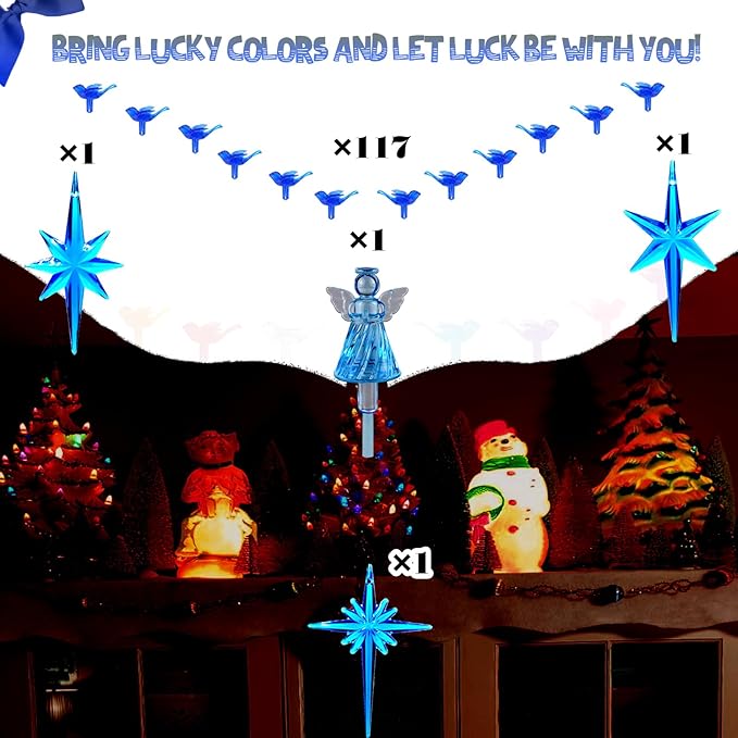 117Pcs Ceramic Christmas Tree Replacement Lights Bulbs Deep Bluebird and 1 Angel/3 Stars Topper Ornament for Ceramic Tree Décor - Medium Plastic Pegs.