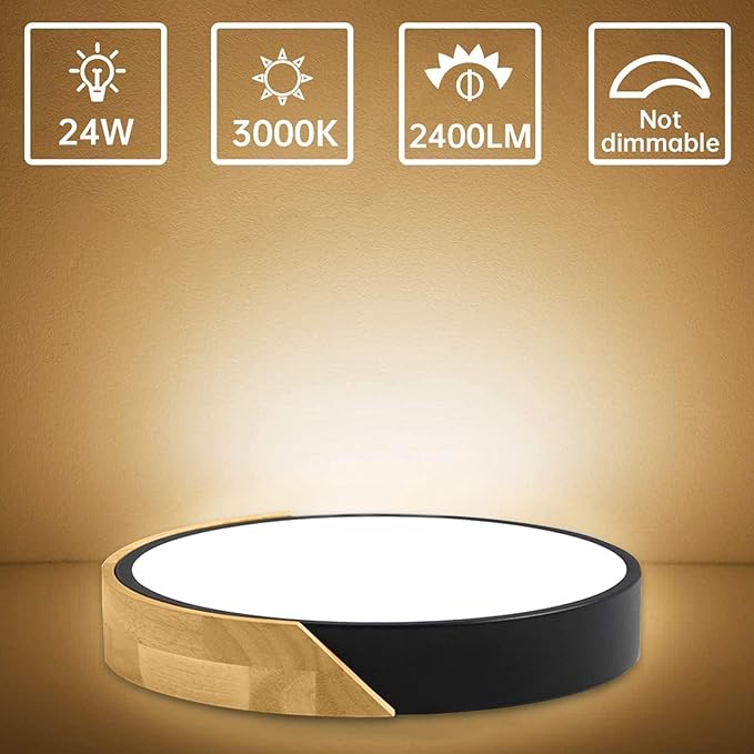 Led Ceiling Light Flush Mount: 12 Inch 24W Bedroom Light Fixture with Round Wood Modern Black Flat Overhead Minimalist Ceiling Lamps for Kitchen Hallway Laundry Warm White 3000K, Not Dimmable