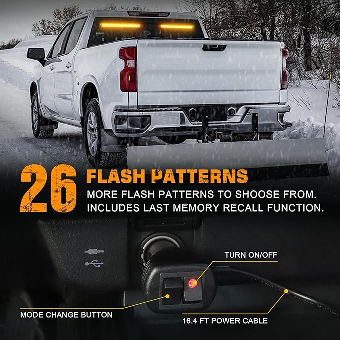 • 26 STROBE FLASH PATTERNS - 12V power, plug and play cigarette plug, convenient dual-switch design. One to turn on/off power supply, one to switch between 26 different flash modes . Including the last mode memory recall. These modes provide warnings for potential imminent dangers.