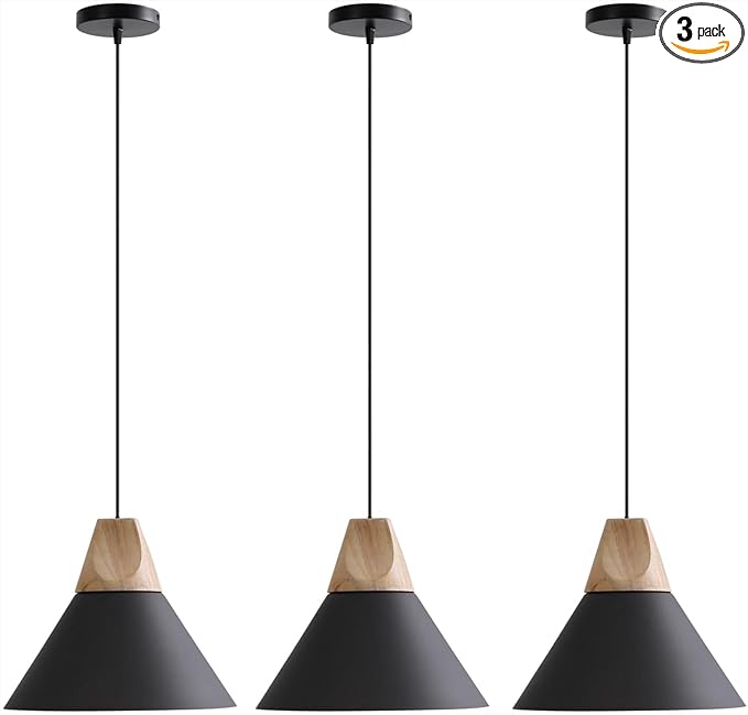 Pendant Light,Solid Wood Ceiling Hanging Lamp,Modern Matte Black Pendant Lighting for Kitchen Island Dining Room Coffee Bar (Black-3 Pack)