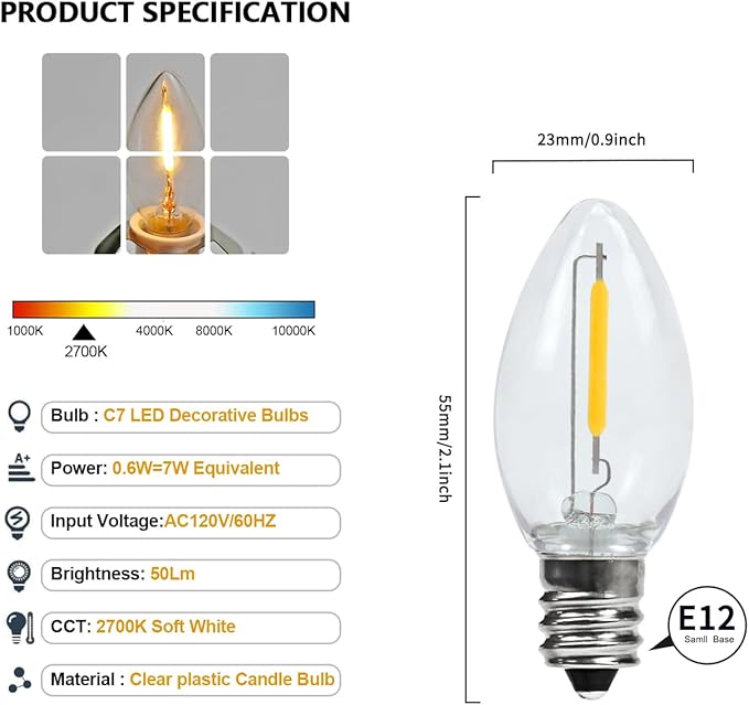 • Special Feature : Bright Warm White Glow, Waterproof and Energy-efficient, Easy to Install with Metal Clips, C7 LED Bulb, Sustainable Cord with On/Off Switch, E12 Base Bright Warm White Glow, Waterproof and Energy-efficient, Easy to Install with Metal Clips, C7 LED Bulb, Sustainable Cord with On/Off Switch, E12 Base