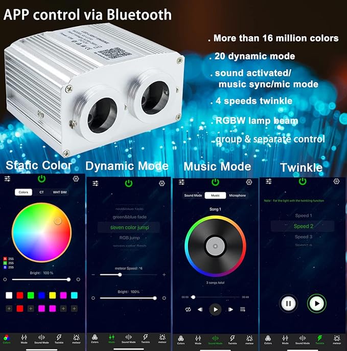 AZIMOM Dual Port 16W Twinkle Fiber Optic Starlight Box Sound Activated RGBW Fiber Optic Light Source APP/Remote Control Dual Head Light Engine Driver for Car Home Ceiling Star Lighting Decor