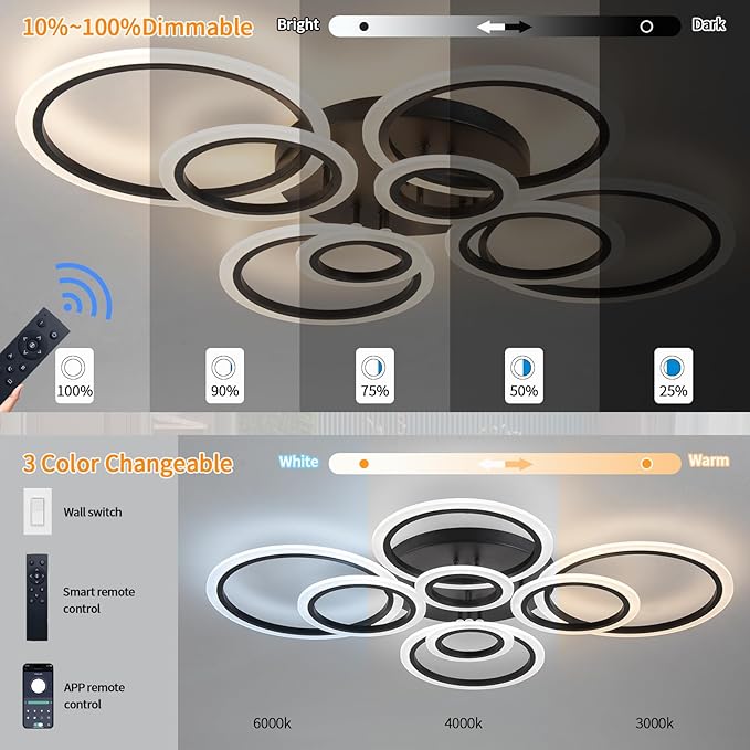 • 🌈Dimmable Ceiling Light: Modern ring chandelier with stepless 5%-100% brightness, 3000-6000K color temperatures dimmable, memory function will remember last light settings
