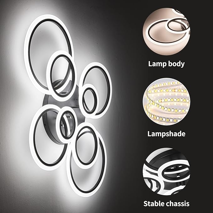 • ⭐LED Flush Mount Ceiling Light: Matte black finished metal pedestal, superior built-in LED strips, acrylic 4 rings low profile ceiling lighting fixture accent minimalist modern style