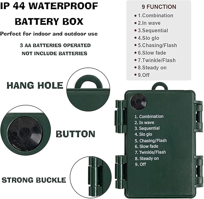 • 8 Lighting Modes & Timer: There are 8 different lighting modes: combination, slow glow, wave, sequential, chasing/flash, slow fade, twinkle/flash, and steady on. Press the button on the battery box to adjust the mode that you like. Turn on the light, it will automatic light 6 hrs first and 18 hrs off lighting.