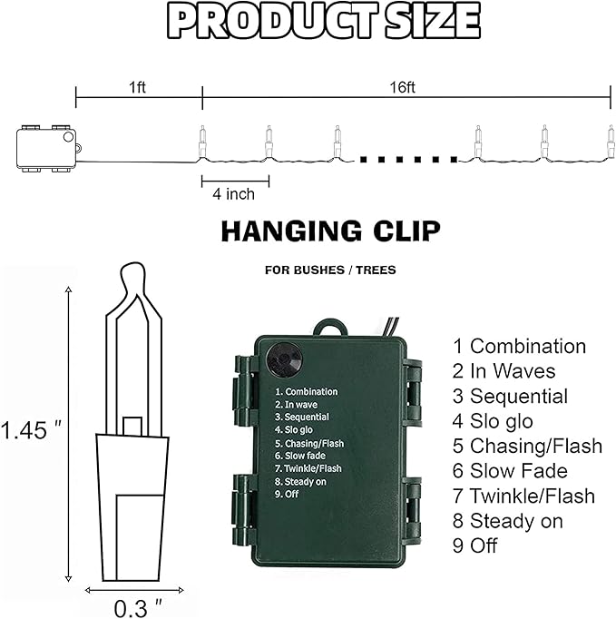 • Christmas Lights for Outdoor Indoor Decor: The lighting length of battery operated Christmas lights is 16 FT, Leading wire is 1 ft, total length is 17 ft. Bulb spacing is 4 inch. The Christmas lights can create a mystery atmosphere for your home.
