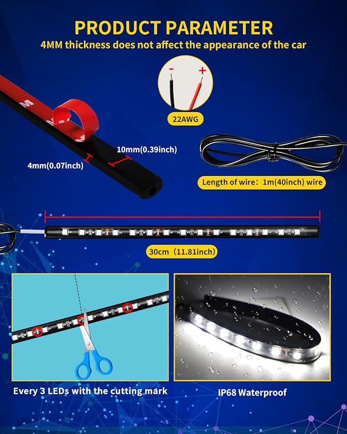 • 【Flexible and Cuttable】Our car neon accent light is flexible, the cutting design enables you to trim the strip light to desirable lengths.【Note】please cut between every 3 LEDs with the cutting mark.