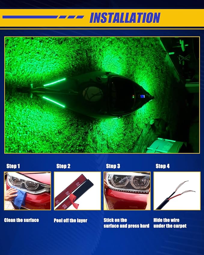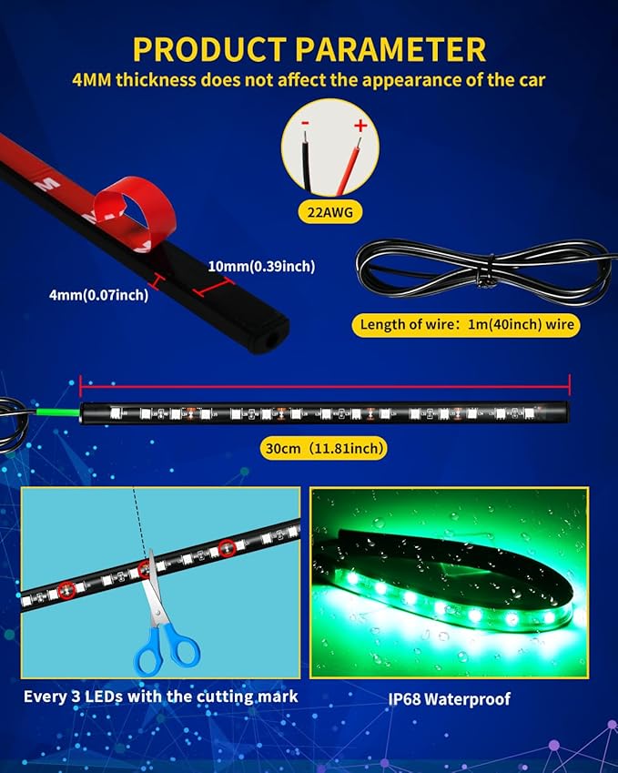 • 【Easy to Install】Our 3M strong Double-sided adhesive on the back of the lights under car enables you to mount it in any where you want.Simply stick the strip light to a dry,clean surface for use for your DIY home lighting needs.
