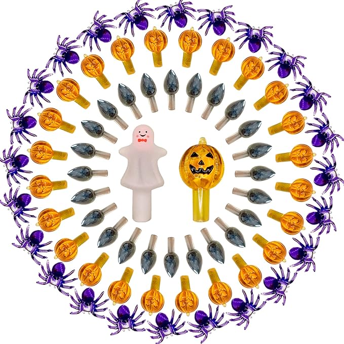 117pcs Halloween Ceramic Tree Replacement Lights Bulbs, Including Spider/Pumpkin Head/Grey Flame & 2pcs Themed Tree Tops (Including Ghost/Pumpkin King) for Decorating Holiday Trees, Etc.