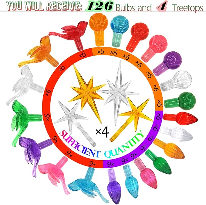 • 【ENOUGH QUANTITY AND VARIOUS STYLES】126 Medium Bulbs (3 Shapes) and 4 Themed Tree Tops (2 Shapes) are great tree peg accessories for decorating large ceramic Christmas trees.