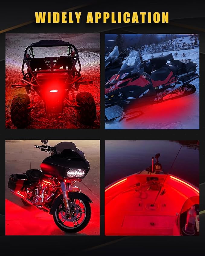 • 【Wide Application】The waterproof led light strips can be used for Golf cart Car Truck Motorcycles Marine Deck Boat Auto Led Atmosphere decoration light Strip footwell, front grille, rear trunk, under car body, underglow, dash lighting,also used home cabinet floor Decoration Steady Light indoor outdoor, Christmas , New Year Festival, KTV, Party strip