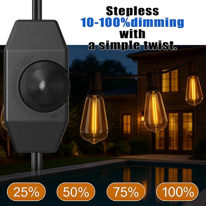 • All-in-One Lighting Solution: Includes a 100 ft commercial-grade cord with 50 sockets (spaced 1.8 ft apart), 50 energy-efficient LED bulbs, and a rotary dimmer.
