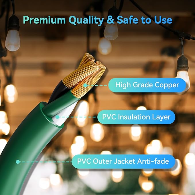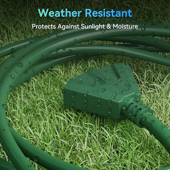 • Safety - UL certification offer quality assurance and includes a grounded plug for maximum safety. The extension cords are made with stranded soft-drawn copper to give you power without dangerous over-heating. Heavy-duty molded on plug ends with strain relief, heat-resistant PVC sleeve. this outdoor extension cord to protect the safety of you and your family.