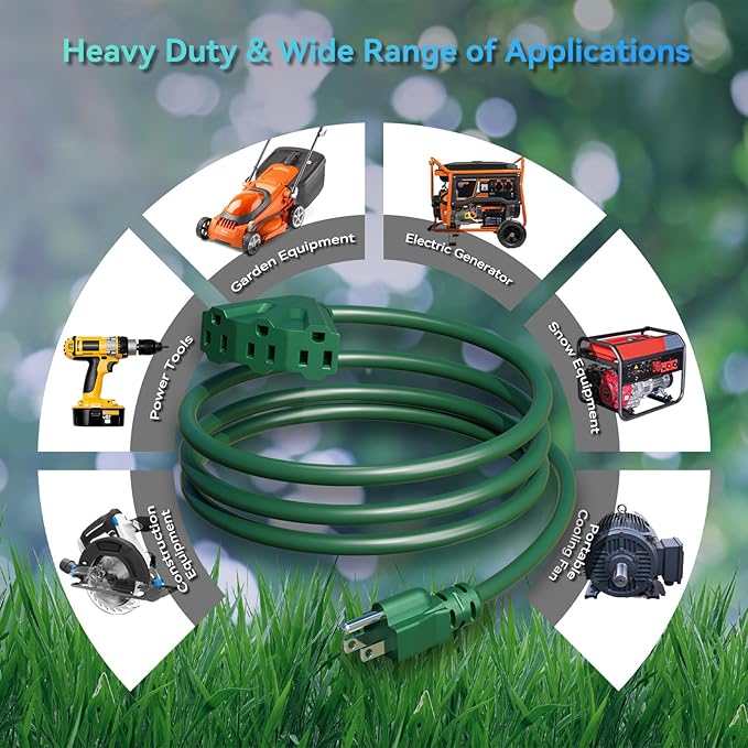 • Indoor & Outdoor Use - Our multi tap pigtails Design lets you use up to 3 appliances/tools at the same time, just makes it easy and convenient, letting you add another tool or any other power device right there without pulling out an extra cord! This power extension cord is designed to extend the connection to your wall outlet or any power devices. Convenient to have for your Home, Office, Garage. Great for landscaping, gardening, and powering appliances such as shop vacs, weed wackers.